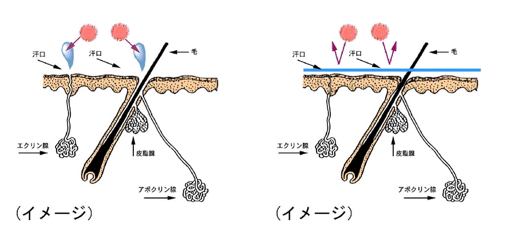 皮脂腺を有効成分で塞ぐことで汗を抑える。