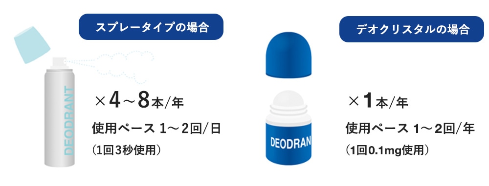 一般のデオドラント製品は通常、朝夜1日2回の使用で約1~2カ月程度で買い替える必要があります(約4〜8本/月)。デオクリスタルは同様の使用頻度で約1年間使用できます(約1個/月)。